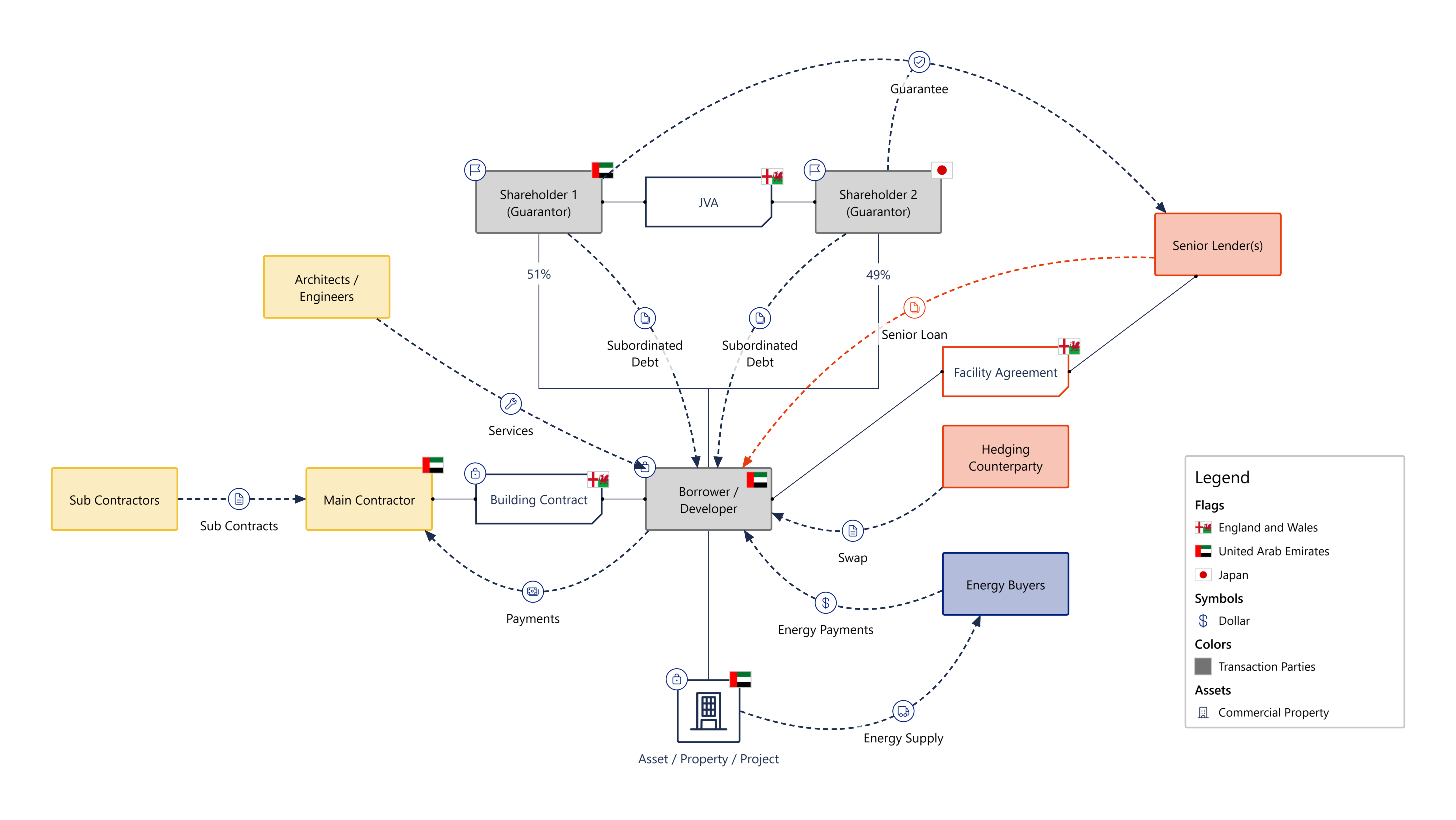 These projects are often extremely complex. They involve a range of negotiations with a wide range of organisations that are party to many different types of contracts relating to the financing or construction of the project. Taking our wind farm example, there will be a huge number of contractors and sub-contractors lined up for the construction, multiple parties providing finance of different types, and energy companies committing to take energy when production finally starts.